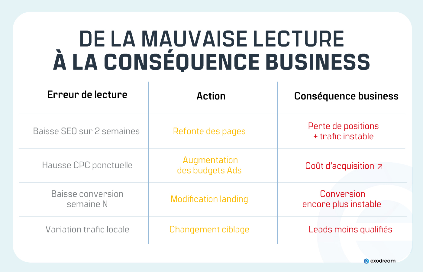 - Une baisse de conversion peut être attribuée à une page ou à un canal, alors qu’elle reflète une évolution plus large de la demande, du ciblage ou de la concurrence.